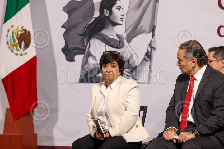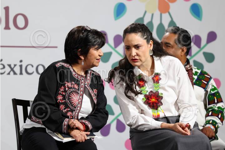 CIUDAD DE MÉXICO, 14JULIO2025.- Edna Vega Rangel, titular de la SEDATU; Claudia Curiel de Icaza, secretaria de Cultura, conversan durante la Mañanera del Pueblo, la primera ofreció información del Programa Nacional de Vivienda y la segunda sobre la designación de la Ruta Wixárika como Patrimonio de la Humanidad por la Unesco. FOTO: MOISES PABLO/CUARTOSCURO.COM