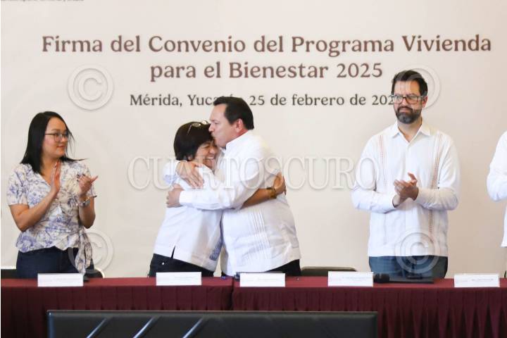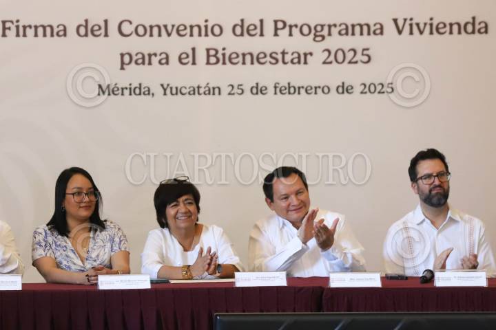 MÉRIDA, YUCATÁN, 25FEBRERO2025.- Edna Vega Rangel, titular de la Secretaría de Desarrollo Agrario, Territorial y Urbano del Gobierno de México (SEDATU), y el gobernador del estado de Yucatán, Joaquín "Huacho" Díaz Mena, firmaron el convenio del programa “Vivienda para el Bienestar” 2025, con el cual se construirán 2,500 viviendas en este año para las familias más necesitadas de Yucatán. FOTO: MARTIN ZETINA/CUARTOSCURO.COM