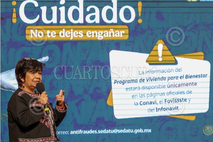 CIUDAD DE MÉXICO, 14JULIO2025.- Edna Vega Rangel, titular de la SEDATU, menciono a la población a no dejar engañarse por supuestos gestores que prometen casas a través del Programa Nacional de Vivienda, ya que reitero que solo será a través de las páginas oficiales como las personas interesadas pueden inscribirse al padrón de vivienda, durante la Mañanera del Pueblo. FOTO: MOISES PABLO/CUARTOSCURO.COM