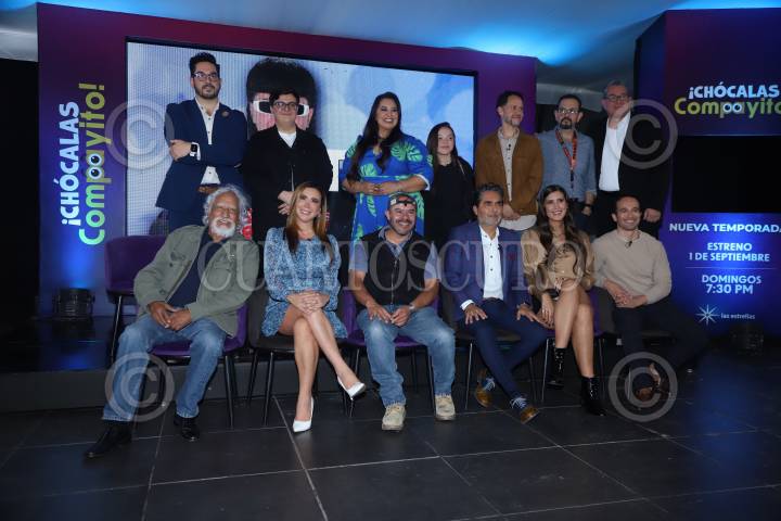 CIUDAD DE MÉXICO, 27AGOSTO2024. Marcelo Barceló, Claudia Acosta, Ana Paula del Moral, Rafael Inclán, Mariazel, Edson Zúñiga, Raúl Araiza, Rocío Gracia y José Luis Rodríguez durante la presentación de la segunda temporada del programa cómico ¡Chócalas Compayito!, en instalaciones de Televisa San Ángel. FOTO: EDGAR NEGRETE LIRA/CUARTOSCURO.COM