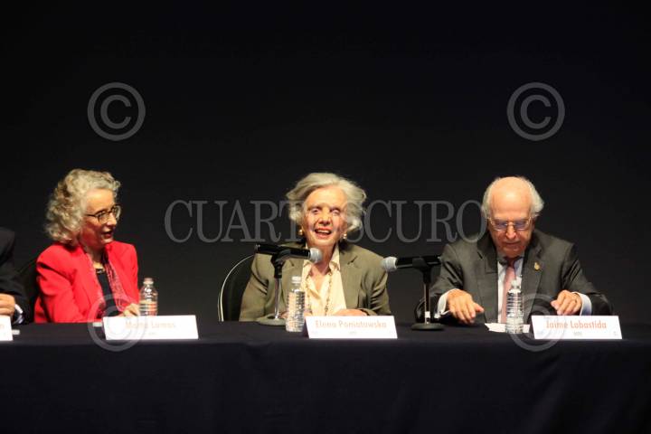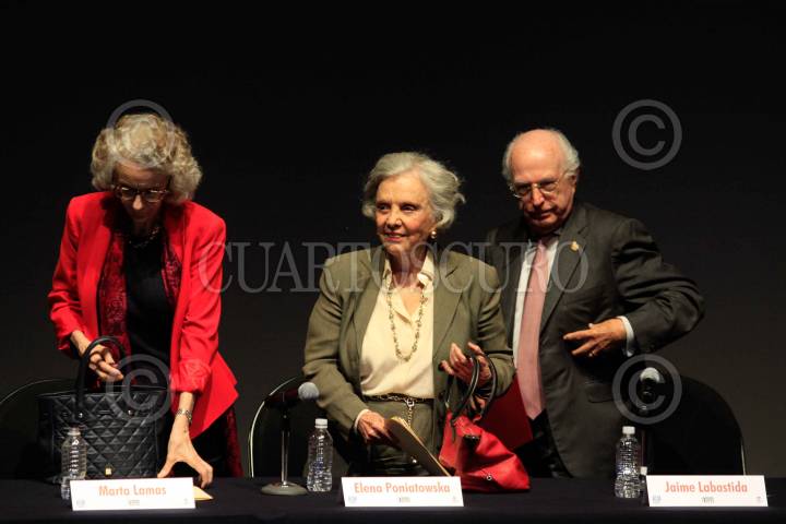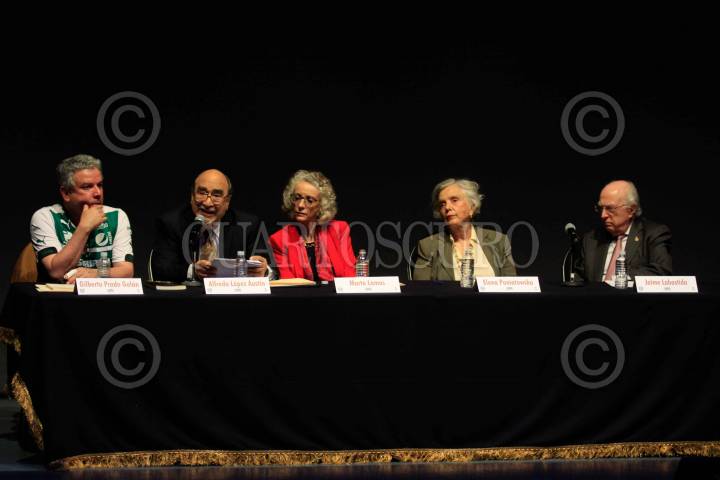 MÉXICO, D.F., 09JUNIO2015.- Guillermo Prado Galan, Alfredo López Austin, Martha Lamas, Elena Poniatowska y Jaime Labastida, durante el homenaje a Eduardo Galeano, realizado en la sala Manuel Covarrubias del Centro Cultural Universitario de la UNAM. FOTO: SAÚL LÓPEZ /CUARTOSCURO.COM/CUARTOSCURO.COM