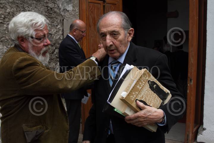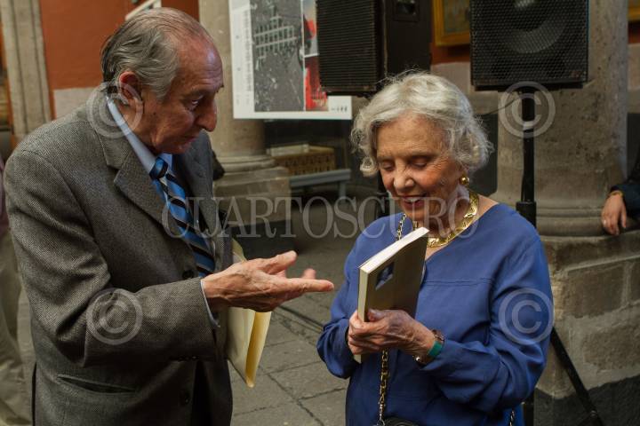 MÉXICO, D.F., 13JUNIO2015.- El poeta Eduardo Lizalde fue homenajeado en el Museo de la Ciudad de México, ahí compartió la mesa con José María Espinasa, Evodio Escalante, Hugo Gutiérrez Vega, María Banda y el secretario de Cultura Eduardo Vázquez, quienes compartieron su visión acerca de su obra. En la imagen el literato conversa con la escritora Elena Poniatowska. FOTO: MOISÉS PABLO /CUARTOSCURO.COM