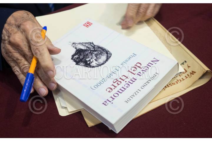 El día de hoy falleció el poeta mexciano Eduardo Lizalde a la edad de 93. En la imagen, el escritor firma autógrafos luego del homenaje luctuoso que la Universidad Nacional Autónoma de México, le rindió al poeta mexicano Rubén Bonifaz Nuño, en la Sala Nezahualcóyotl de Ciudad Universitaria, el 04 de abril de 2013. FOTO: JUAN PABLO ZAMORA /CUARTOSCURO.COM