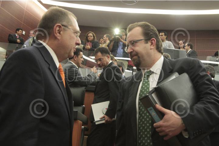 MÉXICO, D.F., 12ABRIL2013.- Eduardo Pérez Motta, titular de la Comisión Federal de Competencia (CFC), y Mony De Swaan, presidente de la Comisión Federal de Telecomunicaciones, al finalizar el foro sobre telecomunicaciones que se realizó en el Senado. FOTO: SENADO DE LA REPÚBLICA /CUARTOSCURO.COM