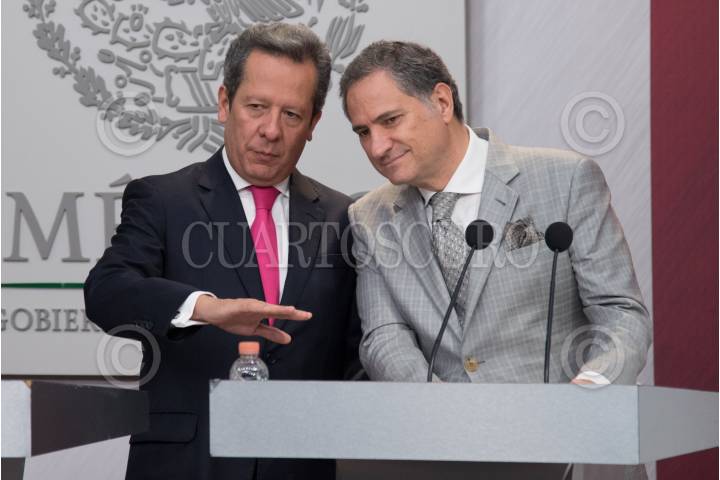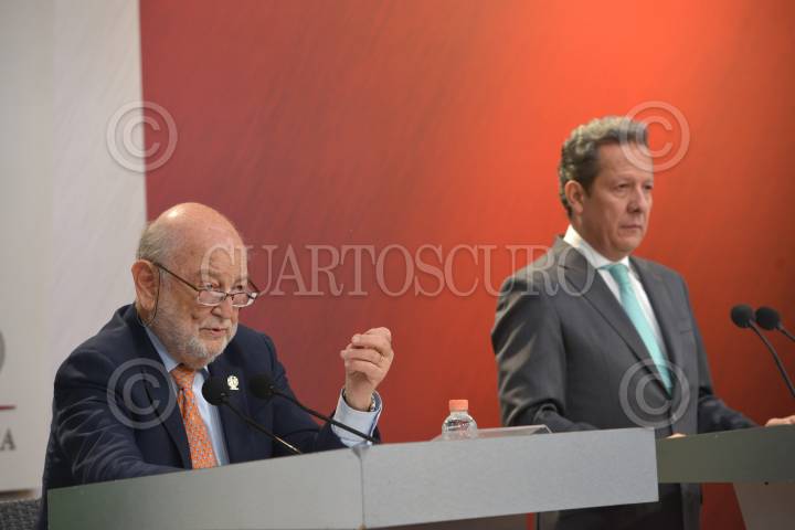 CIUDAD DE MÉXICO, 31MAYO2018.- Otto Granados Roldán, secretario de Educación Pública, y Eduardo Sánchez Hernández, Coordinador General de Comunicación Social de la Presidencia y Vocero del Gobierno de la República, en conferencia de prensa informaron sobre los avances que ha tenido de la Reforma Educativa, en el ámbito de evaluación docente, en donde han participado más de un millón 277 mil maestros, gracias de los cuales se han otorgado 190 mil plazas por promociones de mérito o por concurso. FOTO: MARIO JASSO /CUARTOSCURO.COM