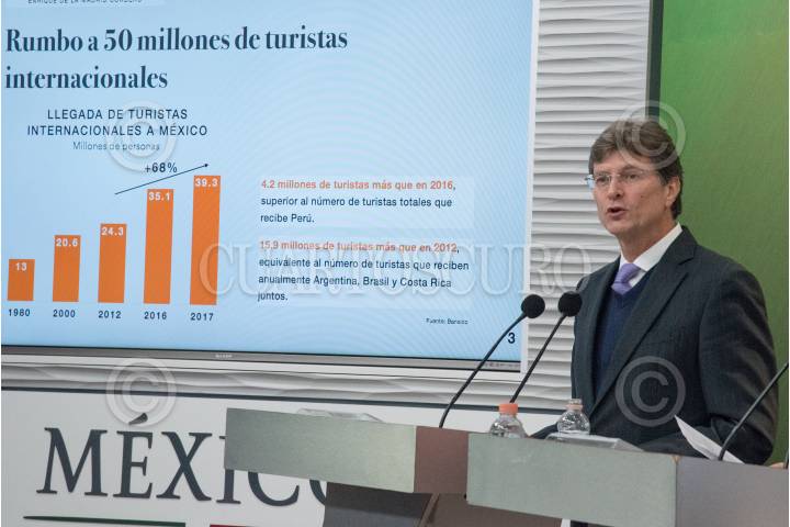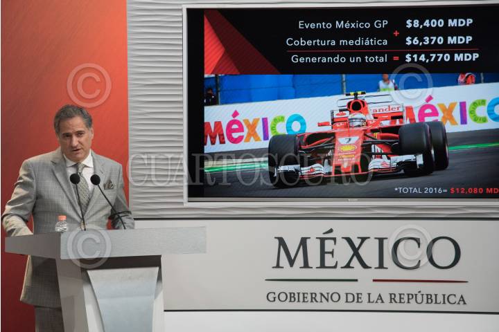 CIUDAD DE MÉXICO, 22FEBRERO2018.- Enrique de la Madrid, secretario de Turismo, durante conferencia de prensa dio aconocer los resultados de la derrama económica, impacto en medios y exposición global del Fórmula 1 Gran Premio de México 2017, el cual contribuyó a la economía del país con $8,400 millones de pesos, más $6,370 millones de pesos, valor de la exposición mediática global, que da como resultado $14,770 millones de pesos. FOTO: MARIO JASSO /CUARTOSCURO.COM