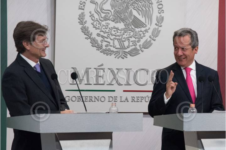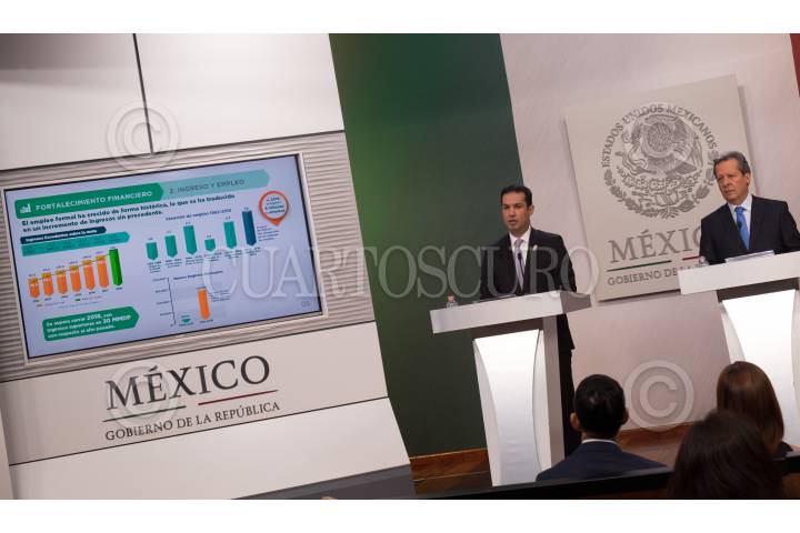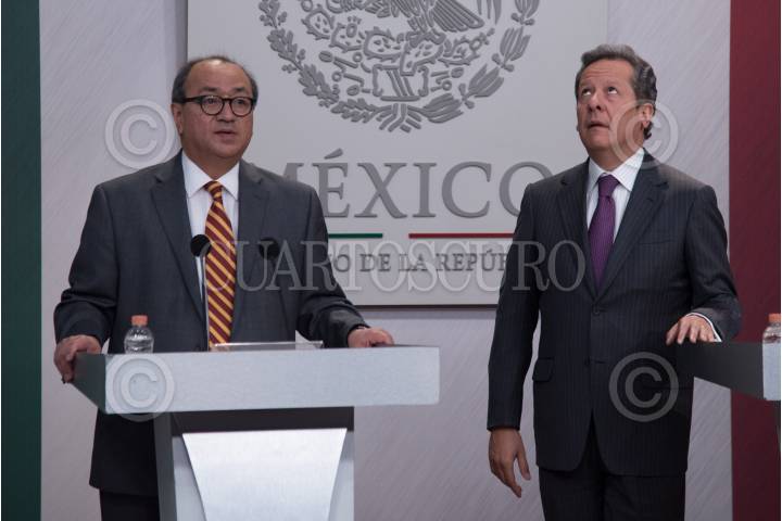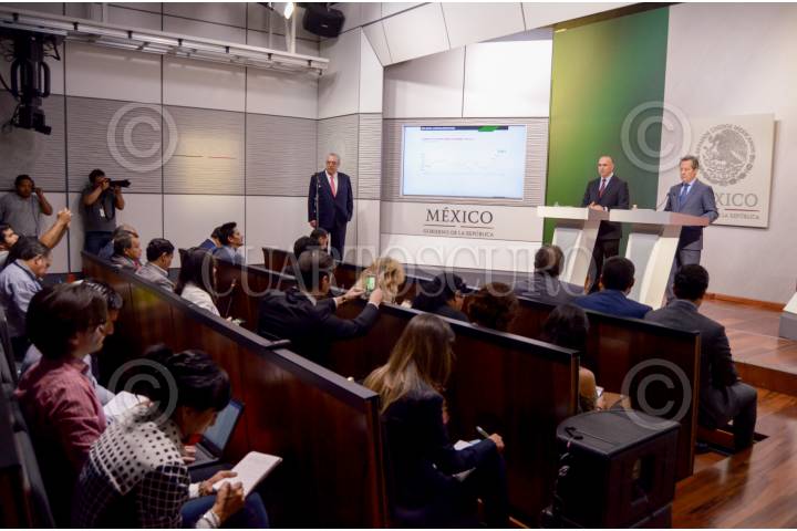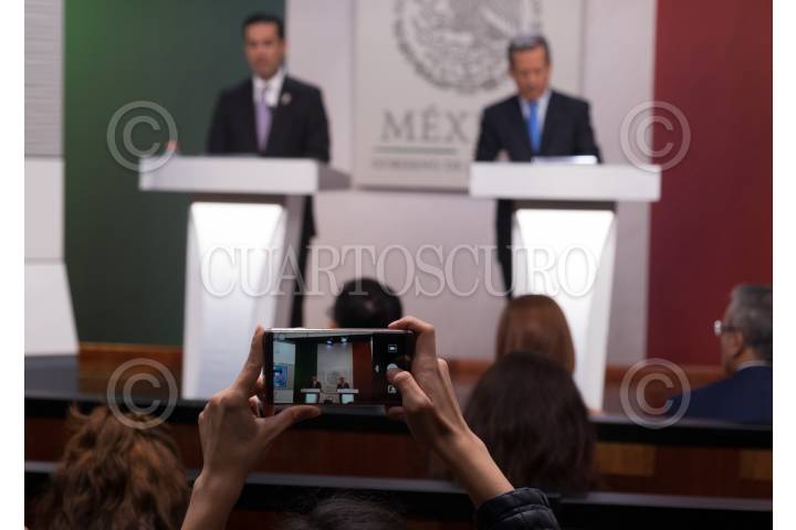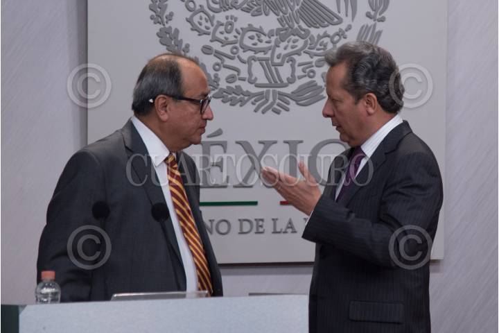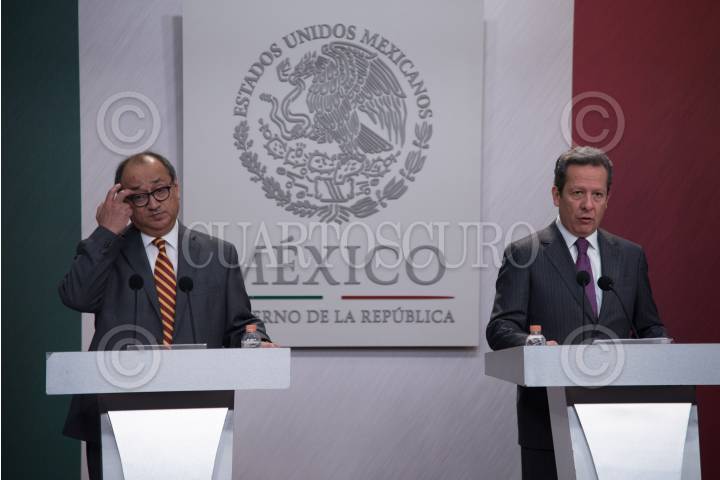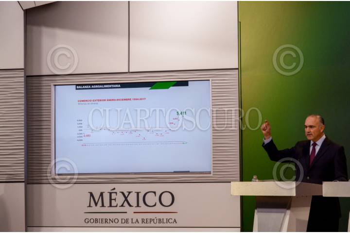 CIUDAD DE MÉXICO 14MARZO2018.- José Calzada Rovirosa, titular de SAGARPA, y Eduardo Sánchez Hernández, vocero del Gobierno de la República, ofrecieron una conferencia de prensa para dar a conocer el crecimiento de la exportaciones agropecuarias durante este sexenio. FOTO: FELIPE ÁNGELES /CUARTOSCURO.COM