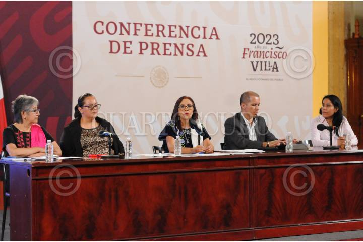 Leticia Ramírez, titular de la SEP, encabeza la conferencia acompañada de docentes que ayudaron a crear los libros de texto.