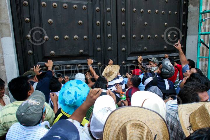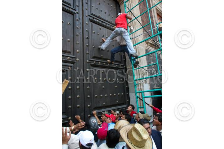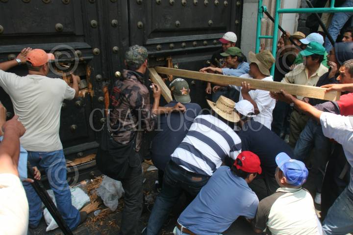 MÉXICO, D.F., 03JUNIO2010.- Maestros de la sección XVII de Michoacan y Oaxaca, así como simpatizantes del SME, se manifestaron en la Bolsa de Valores, posteriormente marcharon hasta las instalaciones de la Secretaria de Educación Pública, donde exigieron hablar con el titular Alonso Lujambio; al no recibir respuesta, trataron de ingresar a las instalaciones de la SEP; minutos después, policías federales respondieron a las agresiones de los inconformes lo que sucitó un enfrentamiento entre los uniformados y los educadores. FOTO: SAÚL LÓPEZ/CUARTOSCURO.COM
