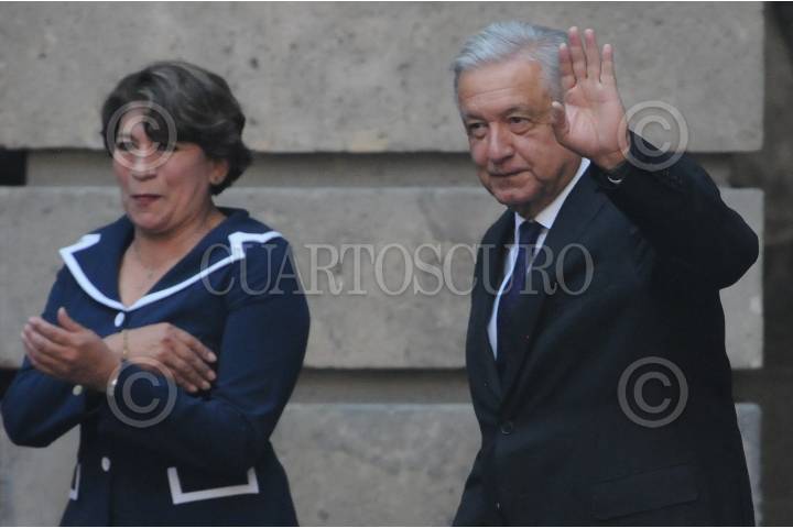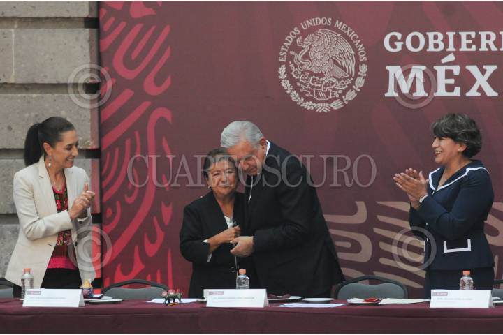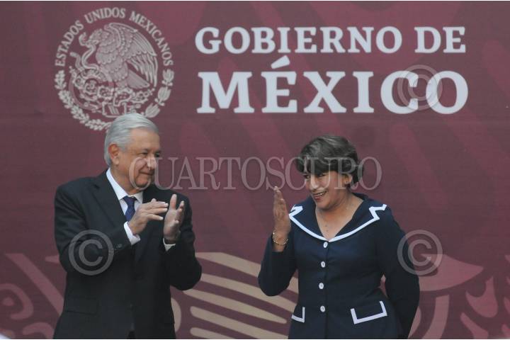 Delfina Gómez, titular de la SEP y Andrés Manuel López Obrador, presidente de México, llegan al evento.