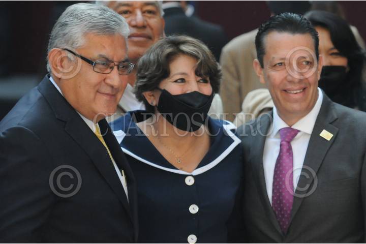 Alfonso Céspedes, secretario general del SNTE, se toma una fotografía con Delfina Gómez, titular de la SEP.