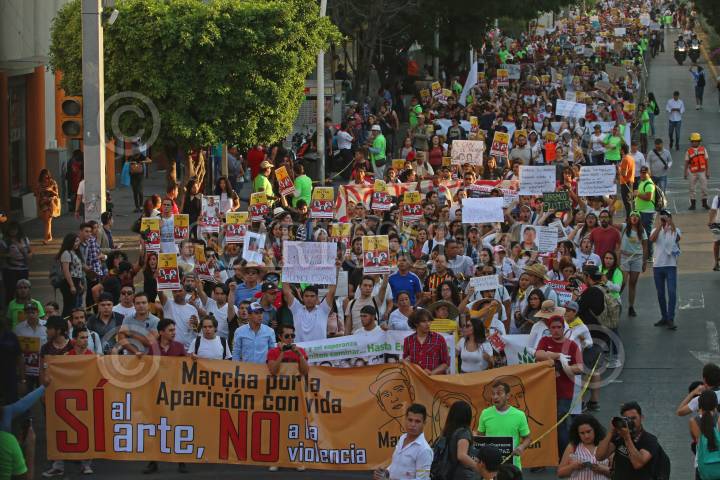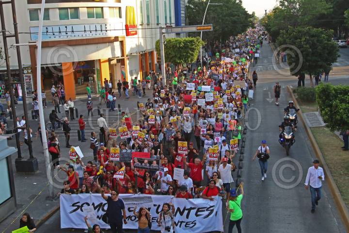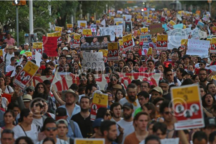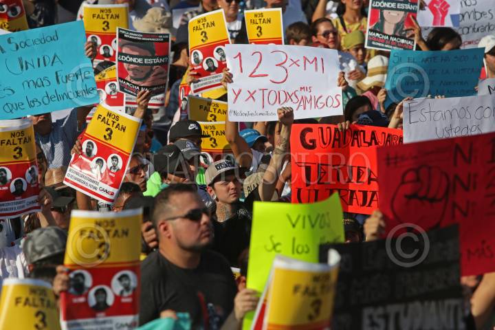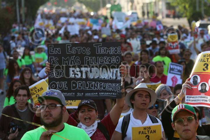 GUADALAJARA, JALISCO, 24MARZO2018.- Miles de personas entre estudiantes, maestros, familiares y amigos de la Universidad de Medios Audiovisuales, de la Universidad de Guadalajara y del ITESO, marcharon de la Glorieta de los Niños Héroes a la Fiscalía General del Estado, para exigir que aparezcan con vida Javier Salomón, Marcos Ávalos y Daniel Díaz estudiantes de cine del CAAV levantados por hombres armados el pasado lunes, así como por todos los desaparecidos de México. FOTO: FERNANDO CARRANZA GARCIA / CUARTOSCURO.COM