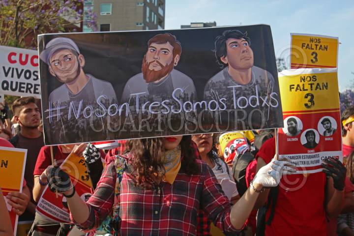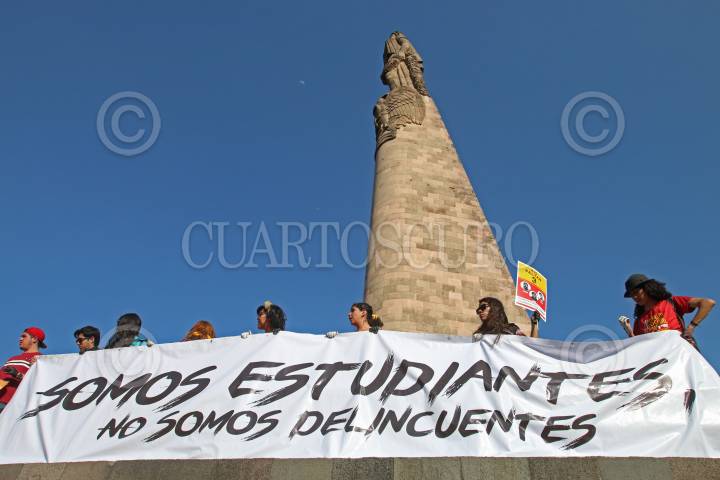 GUADALAJARA, JALISCO, 22MARZO2018.- Cientos de personas entre estudiantes, maestros, familiares y amigos, de la Universidad de Medios Audiovisuales, marcharon de las instalaciones educativas hacia el monumento a los Niños Héroes para exigir que aparezcan con vida Javier Salomón, Marcos Ávalos y Daniel Díaz estudiantes de cine, desaparecidos el pasado lunes en el municipio de Tonalá. FOTO: FERNANDO CARRANZA GARCIA / CUARTOSCURO.COM