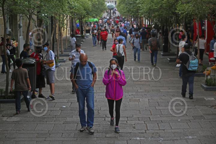 Tapatíos caminan por el corredor de la calle Morelos en el centro de la ciudad, la gran mayoría se protege con el cubre bocas, según la Secretaria de Salud Jalisco hubo un incremento del 12 por ciento en comparativa a la semana pasada y se dice que si esto continua así la cifra podría alcanzar los 400 contagios por cada millón de habitantes, los cual seria alarmante para la ciudadanía.