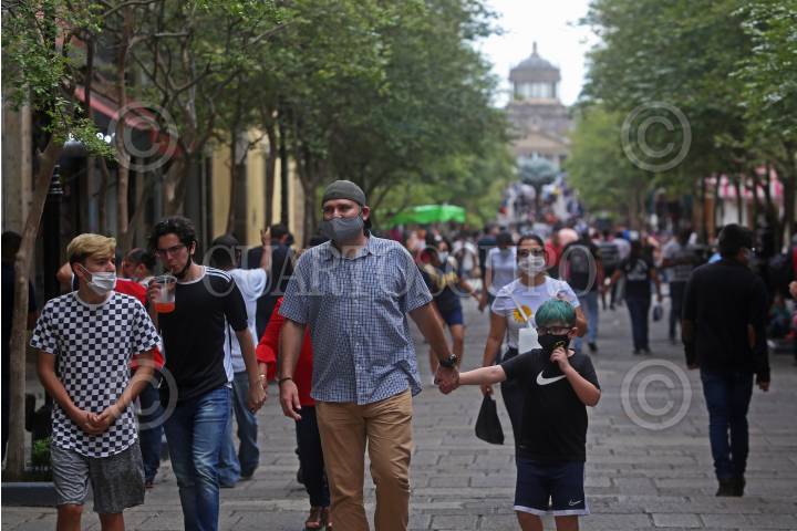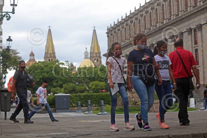 Tapatíos caminan por el Paseo Degollado en el centro de la ciudad, la gran mayoría se protege con el cubre bocas, según la Secretaria de Salud Jalisco hubo un incremento del 12 por ciento en comparativa a la semana pasada y se dice que si esto continua así la cifra podría alcanzar los 400 contagios por cada millón de habitantes, los cual seria alarmante para la ciudadanía.