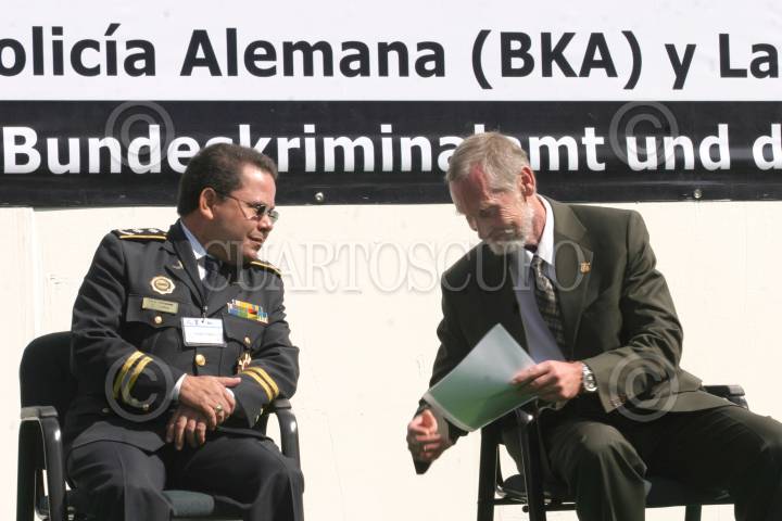 MEXICO, DF, 10OCTUBRE2005.- Edwin Cordero, jefe de la policia de Nicaragua conversa con Piter Fobé, jefe de la policia Alemana (BKA) durante la ceremonia de inauguración del Simposium de Jefes de Policia de Centro América, el Caribe, Alemania y México. FOTO: Nelly Salas/CUARTOSCURO.COM