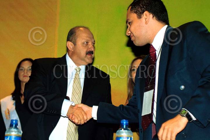 Reyes Taméz, secretario de Educación Pública, saluda a Edwin Valdés, representante de Consejo Mexicano de la Juventud, al iniciar el encuentro nacional juvenil ¨Ni un paso atrás.. todo por la transición¨, en el World Trade Center. FOTO: Moisés Pablo/CUARTOSCURO.COM