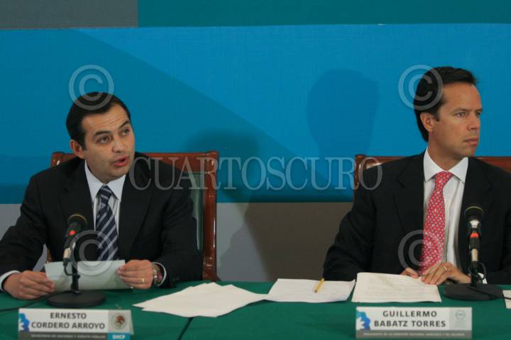 MÉXICO, D.F., 15JUNIO2010.- Ernesto Cordero Arroyo, Secretario de Hacienda y Guillermo Babatz Torres, presidente de la Comisión Nacional Bancaria y de Valores, ofrecieron una rueda de prensa en Palacio Nacional para hablar sobre la regulación sobre efectivo en dólares. FOTO: IVÁN MENDEZ/CUARTOSCURO.COM
