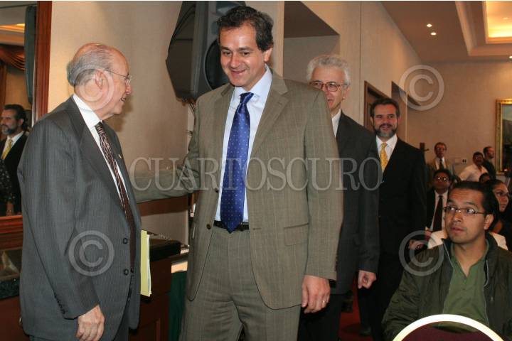 MÉXICO, D.F. 26MARZO2007.- El secretario de Medio Ambiente, Rafael Elvira Quezada y Jaime Lomelín durante la presentación de avances del Programa Voluntario de Contabilidad y Reporte de Gases de Efecto Invernadero, que se llevò a cabo en un hotel de la ciudad. FOTO: PAOLA HIDALGO/CUARTOSCURO.COM