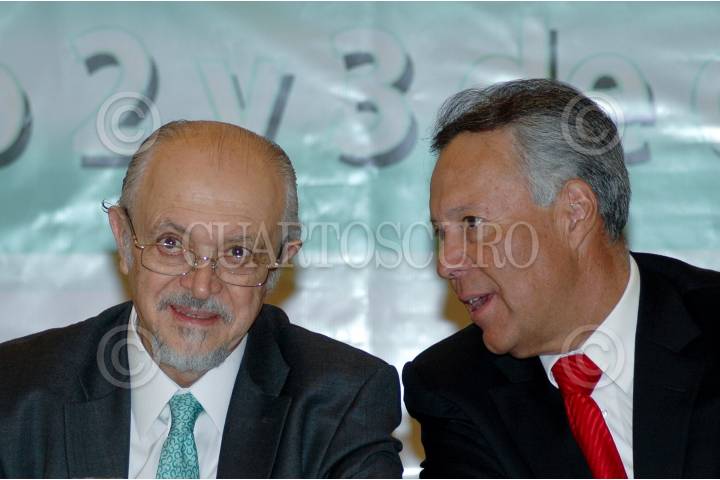 MÉXICO, D.F., 02DICIEMBRE2009.- Mario Molina, premio nobel de química conversa con Gustavo Cardenas Monroy, secretario del Medio Ambiente del Estado de México durante el Seminario Internacional sobre la Calidad del Aire y Efectos a la Salud. FOTO: RODOLFO ANGULO/CUARTOSCURO.COM
