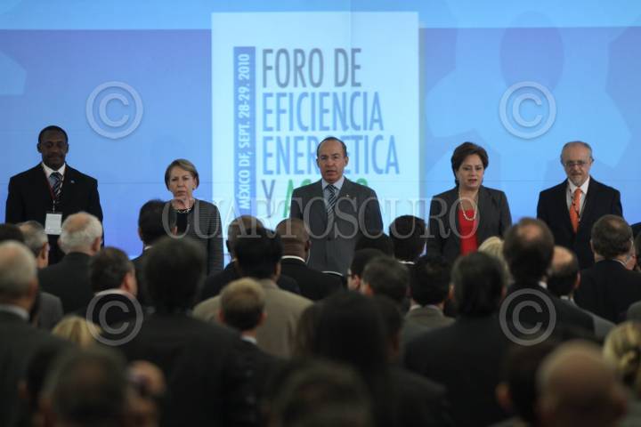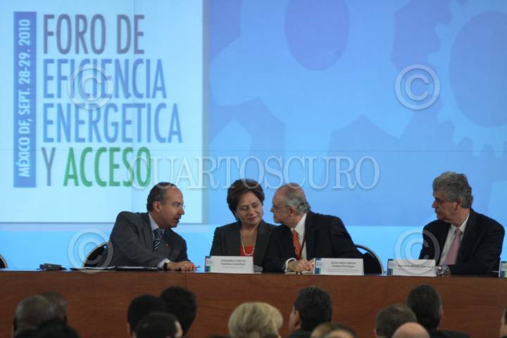 MÉXICO, D.F., 29SEPTIEMBRE2010.- Kamdeh Yumkella, presidente del Grupo Asesor de la ONU en temas de Energía y Cambio Climático (AGECC por sus siglas en inglés), Georgina Kessel, secretaría de Energía, Felipe Calderón Hinojosa, Presidente de México, Patricia Espinosa Cantellano, secretaria de Relaciones Exteriores, Mario Molina, premio Nobel de química 1995 y Alfredo Elías Ayub, director de la Comisión Federal de Electricidad, durante el foro eficiencia energética y acceso en la sede de la cancillería mexicana. FOTO: MOISÉS PABLO/CUARTOSCURO.COM