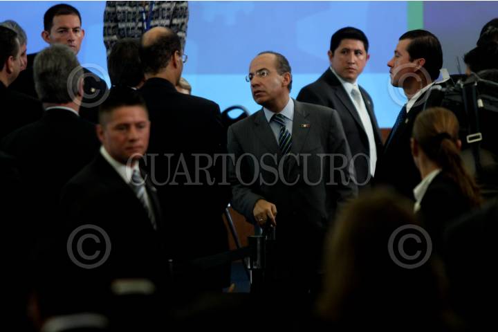 MÉXICO, D.F., 29SEPTIEMBRE2010.- Felipe Calderón Hinojosa, Presidente de México, encabezó el foro eficiencia energética y acceso en la sede de la cancillería mexicana. En la imagen el mandatario rodeado de elementos del Estado Mayor. FOTO: MOISÉS PABLO/CUARTOSCURO.COM