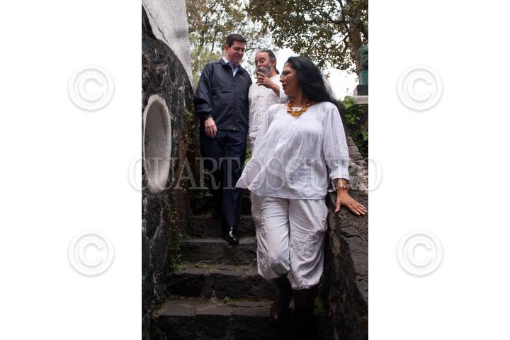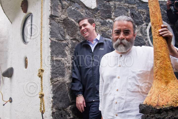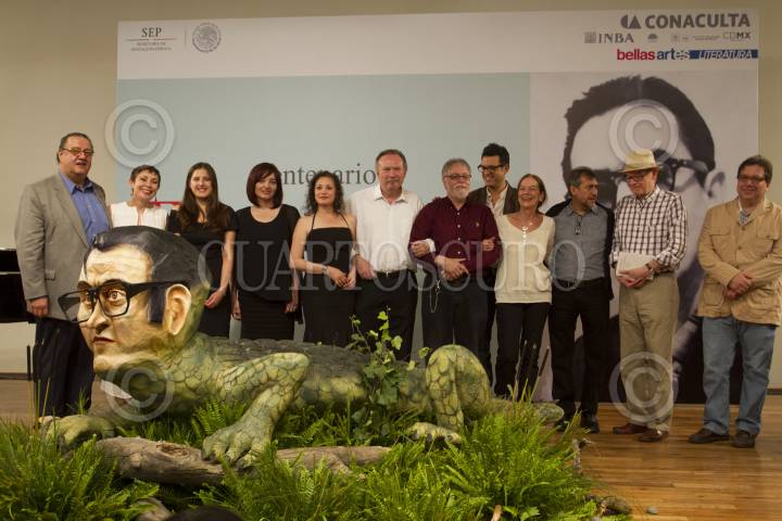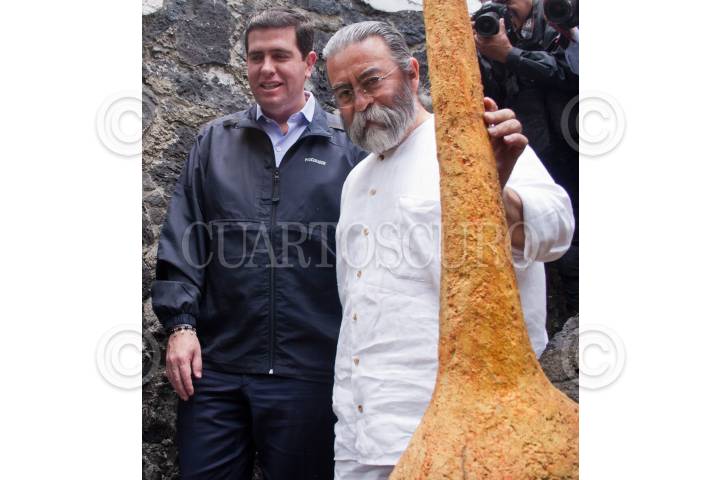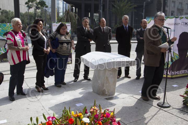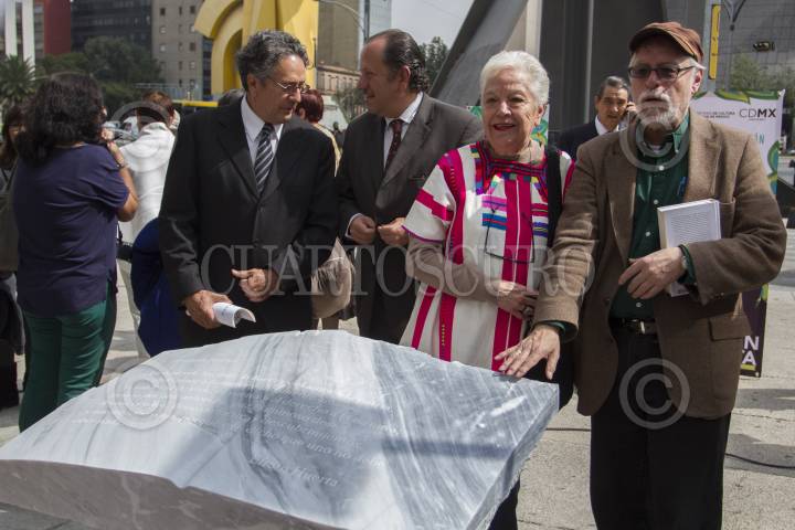 MÉXICO, D.F., 09JULIO2014.- Eduardo Vázquez Martín, titular de la Secretaria de Cultura del Distrito Federal, acompañado de Andrea Huerta, Daniel Huerta en cabezo la ceremonia de la debelación de la escultura homenaje al escritor Efraín Huerta, que fue colocada en avenida Juárez e Iturbide en la colonia Centro. FOTO: GUILLERMO PEREA /CUARTOSCURO.COM
