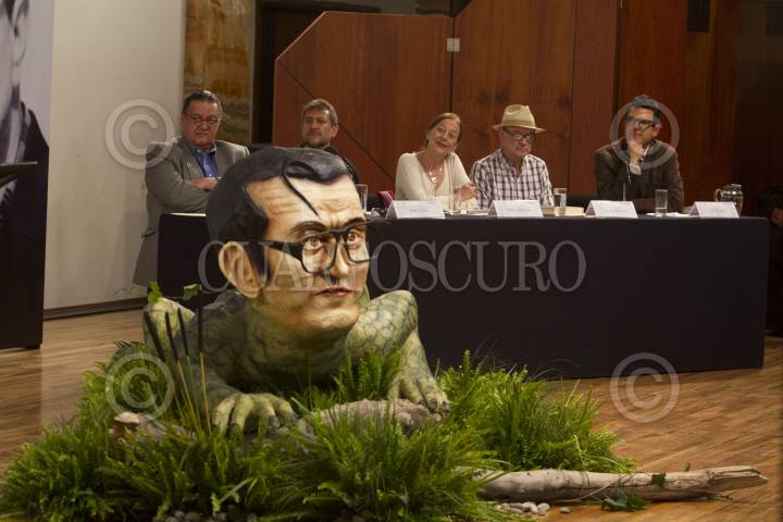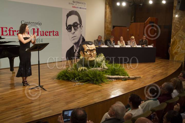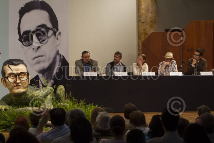 MÉXICO, D.F., 15JUNIO2014.- Jorge Fernández, Rafael Aviña, Mónica Mansour, Francisco Hernández y Julio Trujillo, durante la mesa de discusión para conmemorar el Centenario del poeta Efraín Huerta en la sala Manuel M. Ponce, del Palacio de Bellas Artes. FOTO: GUILLERMO PEREA /CUARTOSCURO.COM