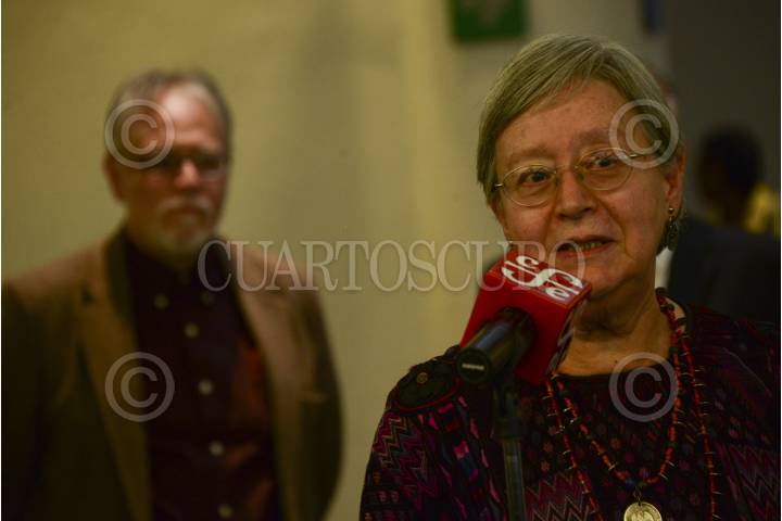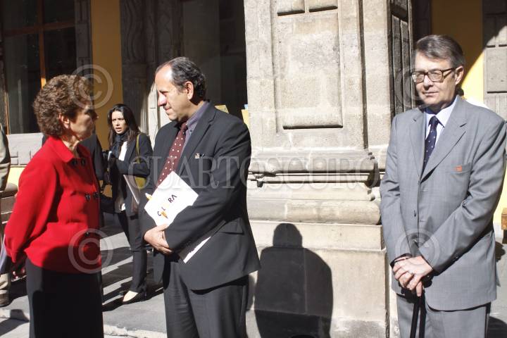MÉXICO, D.F., 09ABRIL2014.- María Cristina García Cepeda, director del INBA, conversa con Eduardo Vázquez Martín, secretario de Cultura del DF, durante la conferencia de prensa en la cual se anunció las actividades por el centenario del natalicio de Efraín Huerta, los observa Alfonso Suárez del Real, subdirector del Metro, la reunión se realizó en Antiguo Colegio de San Ildefonso. FOTO: MOISÉS PABLO /CUARTOSCURO.COM