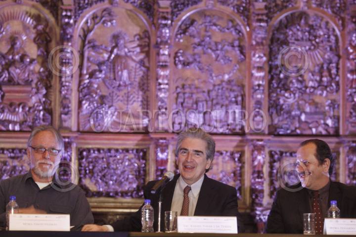 MÉXICO, D.F., 09ABRIL2014.- David Huerta, poeta y escritor, Rafael Tovar y de Teresa, director del Conaculta y Eduardo Vázquez Martín, secretario de Cultura del DF, durante la conferencia de prensa en la cual se anunció las actividades por el centenario del natalicio de Efraín Huerta, la reunión se realizó en Antiguo Colegio de San Ildefonso. FOTO: MOISÉS PABLO /CUARTOSCURO.COM