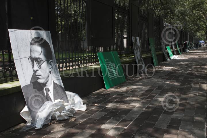MÉXICO, D.F., 30JULIO2014.- Fotografías de gran formato del poeta Efraín Huerta son colocada sobre las rejas de Chapultepec en avenida Reforma, las cuales forman parte de la exposición "Imagen y Palabra Paz, Huerta y Revueltas" en el marco del natalicio de sus 100 años. FOTO: MOISÉS PABLO /CUARTOSCURO.COM