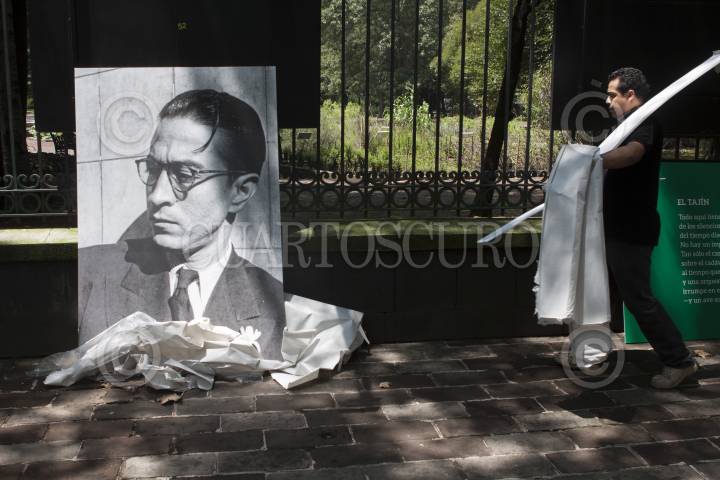 MÉXICO, D.F., 30JULIO2014.- Fotografías de gran formato del poeta Efraín Huerta son colocada sobre las rejas de Chapultepec en avenida Reforma, las cuales forman parte de la exposición "Imagen y Palabra. Paz, Huerta y Revueltas" en el marco del natalicio de sus 100 años. FOTO: MOISÉS PABLO /CUARTOSCURO.COM