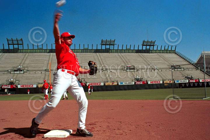 Efrén Espinoza, segunda base de los Diablos Rojos del México, durante el entrenamiento que realizaron esta mañana en el Foro Sol. FOTO: Pedro Mera/CUARTOSCURO.COM