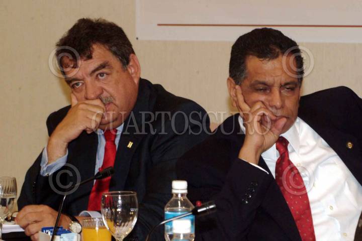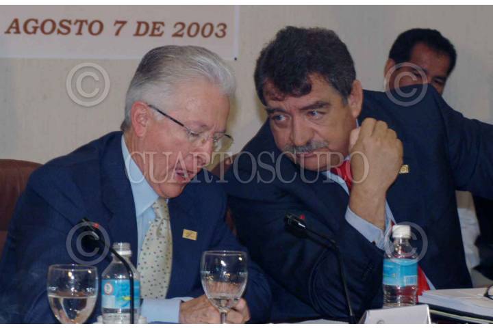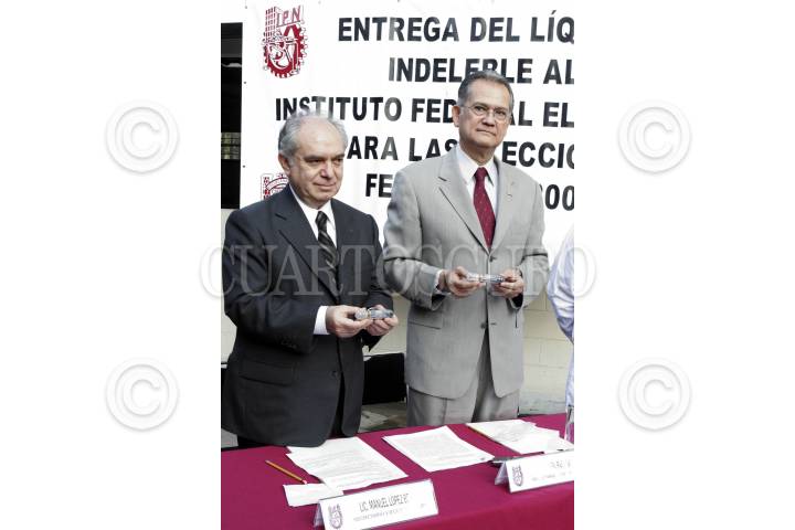 MÉXICO D.F. 06 MAYO 2006.-Manuel López Bernal secretario Instituto Federal Electoral Efren Parras Arias secretario general del Instituto Politécnico Nacional, durante la entrega de la tinta indeleble al Instituto Federal Electoral, que sera utilizado en el proximo proceso electoral. FOTO:Heriberto Perez/ CUARTOSCURO.COM