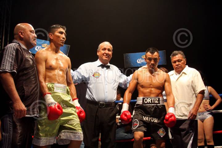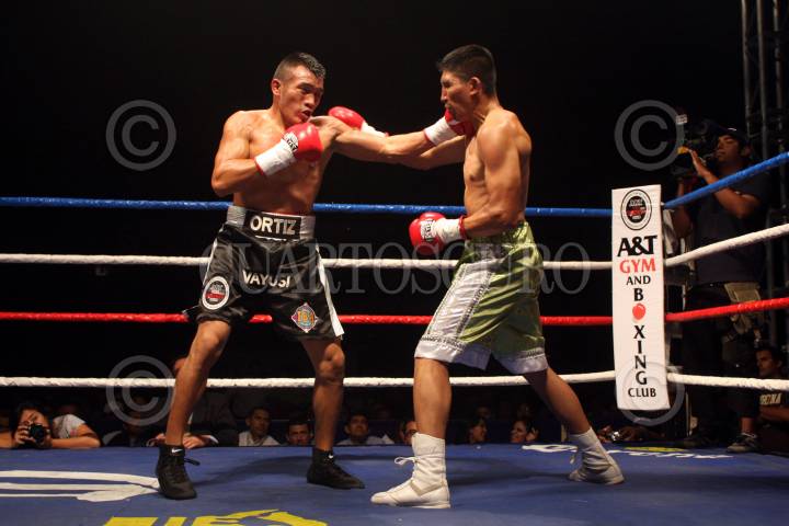 MÉRIDA, YUCATÁN, 20FEBRERO2011.- La noche de ayer el yucateco Silverio "Chamaco" Ortiz (calzoncillo negro) noqueó sin problema a Efrén Hinojosa (calzoncillo verde), al minuto con 56 segundos del segundo asalto para retener el cetro de peso superligero de la Asociación Internacional de Boxeo (IBA), en la función sabatina en el Polifórum Zamná. FOTO: FRANCISCO BALDERAS/CUARTOSCURO.COM