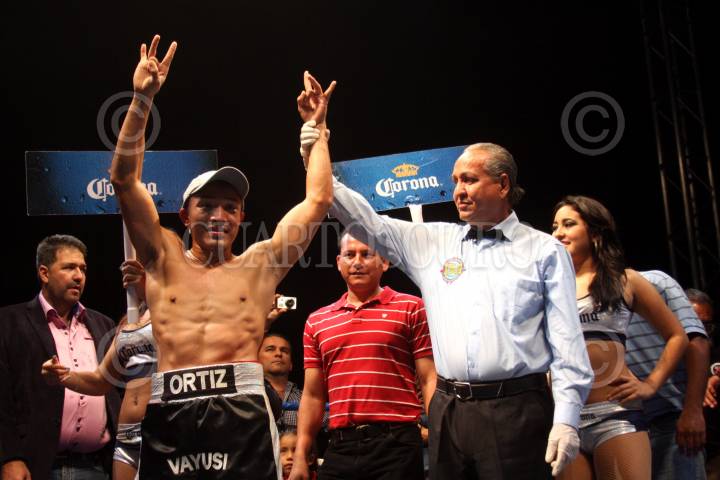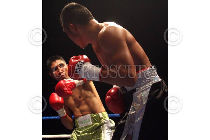 MÉRIDA, YUCATÁN, 20FEBRERO2011.- La noche de ayer el yucateco Silverio "Chamaco" Ortiz (calzoncillo negro) noqueó sin problema a Efrén Hinojosa de California (calzoncillo verde), al minuto con 56 segundos del segundo asalto para retener el cetro de peso superligero de la Asociación Internacional de Boxeo (IBA), en la función sabatina en el Polifórum Zamná. FOTO: FRANCISCO BALDERAS/CUARTOSCURO.COM