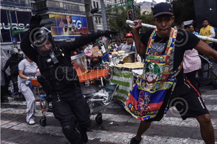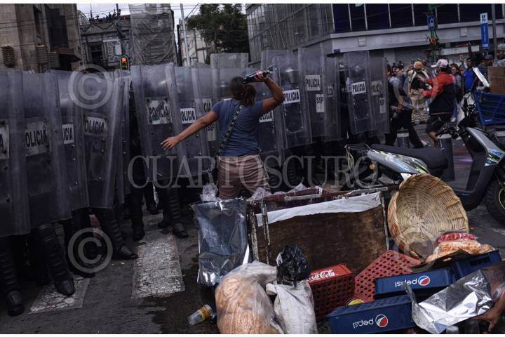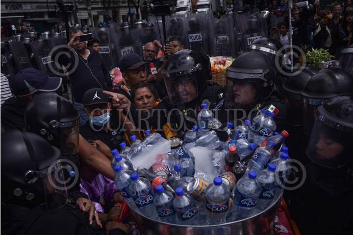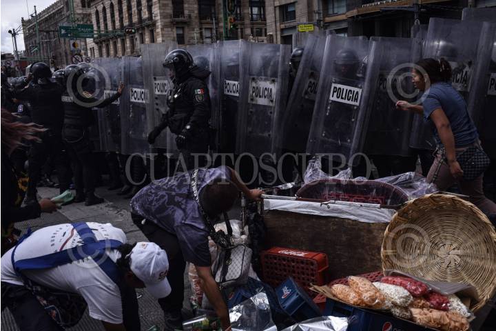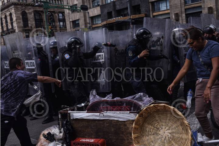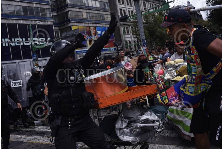 CIUDAD DE MÉXICO, 21JUNIO2024.- Elementos de la policía de la ciudad desalojaron a vendedores ambulantes de la Alameda Central que se encontraban protestando bloqueando la avenida Eje Central. FOTO: PEDRO ANZA /CUARTOSCURO.COM