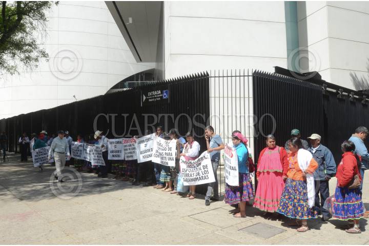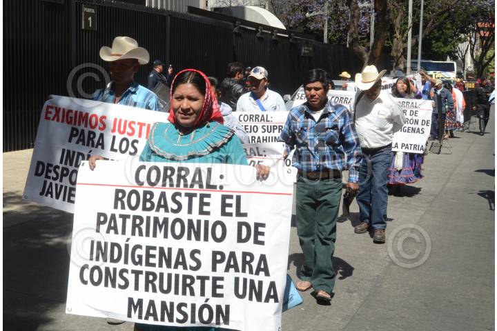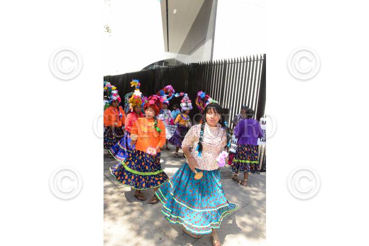 MÉXICO, D.F., 05MARZO2015.- Integrantes de la Comunidad Tarahumara realizaron una singular manifestación con danzas de la etnia raramuri contra el senador Javier Corral, a quien responsabilizan del despojo de tierras para uso ejidal y convertirlas en zonas urbanas, lo que perjudica la vida de lo que viven en Chihuahua, además de obligarlos a emigrar a Estados Unidos. FOTO: ARMANDO MONROY /CUARTOSCURO.COM