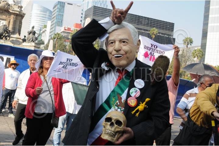 Una persona disfrazada de Andrés Manuel López Obrador, durante la marcha en contra de la Reforma Electoral.
