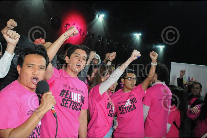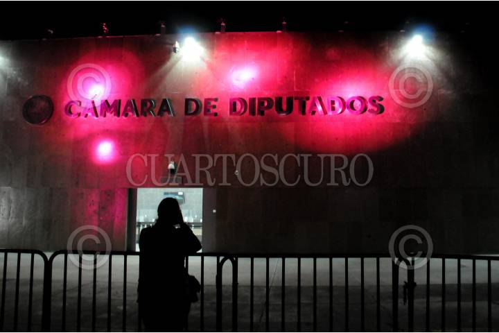 Manifestantes iluminaron re rosa la fachada de la Cámara de Diputados previo a la discusión de la Reforma Electoral mañana en el pleno.