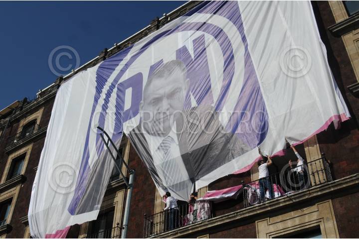 Luego de arrancar la manta con la imagen de Genaro García Luna, los asistentes de la marcha la arrojaron a la fachada de Palacio Nacional.