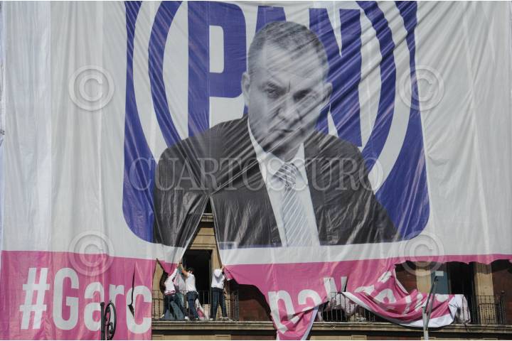 Asistentes de la marcha arrancaron y retiraron la manta de la imagen de Genaro García Luna.