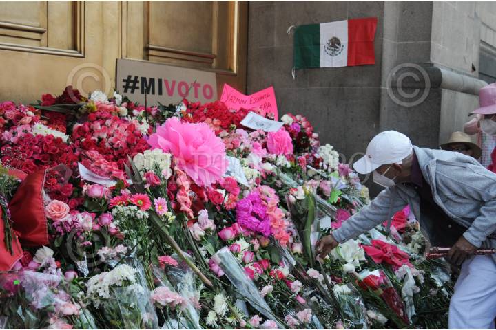 Personas colocan flores frente a la puerta de la Suprema Corte de Justicia de la Nación.