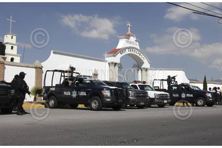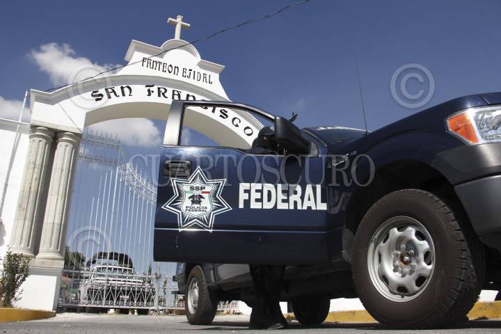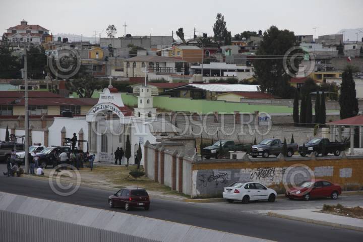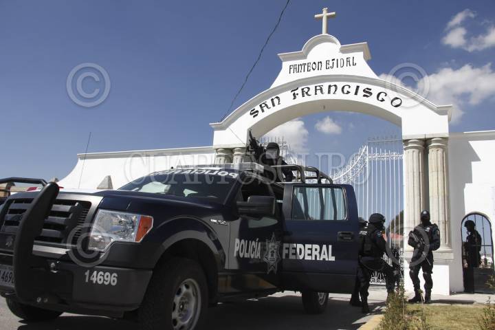 PACHUCA, HIDALGO, 22OCTUBRE2012.- Desde temprana hora elementos de la Policía Federal custodian el panteón ubicado en El Tezontle, al sur de la ciudad de Pachuca. Al interior de este cementerio autoridades periciales realizan la exhumación de los cuerpos de los padres de Heriberto Lazcano, alias El Lazca, para corroborar la identidad del cadáver que las autoridades atribuyen a este líder, quien presuntamente fue abatido en semanas recientes al norte del país. FOTO: FRANCISCO VILLEDA /CUARTOSCURO.COM
