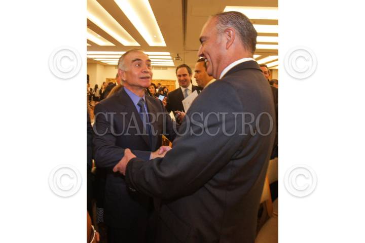 CIUDAD DE MÉXICO, 25FEBRERO201.- José Calzada Rovirosa, secretario de Agricultura, ofreció la ponencia "El campo mexicano, sector estratégico" en el marco de la Semana Agroalimentaria en el Club de Industriales. En la imagen el priista saluda al empresario regiomontano Alfonso Romo. FOTO: ALEJANDRO ZUÑIGA /CUARTOSCURO.COM