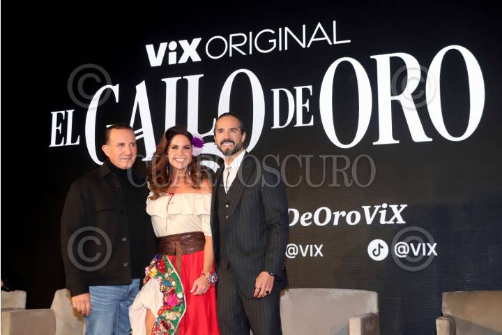 CIUDAD DE MÉXICO, 17OCTUBRE2023.- Los protagonistas Plutarco Haza, Lucero y José Ron durante la conferencia de prensa de la serie de ViX “El Gallo de Oro” en instalaciones del restaurante Arroyo. FOTO: EDGAR NEGRETE LIRA/CUARTOSCURO.COM