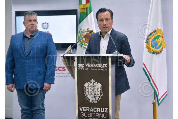 XALAPA, VERACRUZ, 06MAYO2019.- El gobernador del estado Cuitláhuac García ofreció una conferencia de prensa acompañado del titular de la SSP, Hugo Gutiérrez Maldonado, donde aclaró que Adrián "N" alias "El Pelón" fue detenido por una orden de aprensión que ya tenia pendiente, por la que un juez le dictó prisión preventiva por dicho caso y no por el multihomicidio en Minatitlán, con el cual también se le vincula, por otra parte aseguro que la alcaldesa de Mixtla Marcela Vallejo fue obligada a rechazar seguridad, por lo que pedirá a la FGR atraiga el caso. FOTO: ALBERTO ROA /CUARTOSCURO.COM