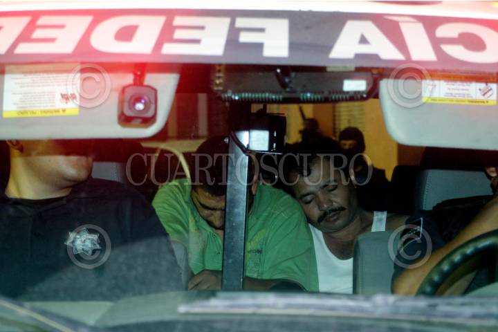 MÉXICO, D.F., 01AGOSTO2008.-Eligio Tamayos Ríos y Eleazar Beltran Beltran, sicarios del cartel de Sinaloa que fueron dentenidos en Culiacán con armamento y equipo tactico de uso exclusivo de las fuerzas federales, fueron trasladados esta madrugada a las instalaciones de la SIEDO. FOTO: LUZ ACEVEDO/CUARTOSCURO.COM