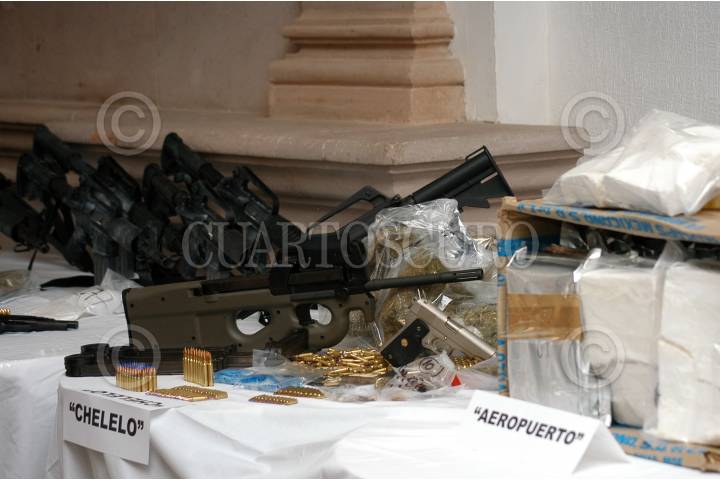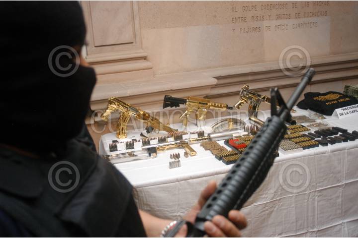 MÉXICO D.F. 23ABRIL2007.-Armas confiscadas durante los operativo donde se dio la detención de Eleazar Medina Rojas, alías El Chelelo, uno de los operadores principales del cártel del Golfo en Nuevo León. FOTO: GUILLERMO PEREA/CUARTOSCURO.COM