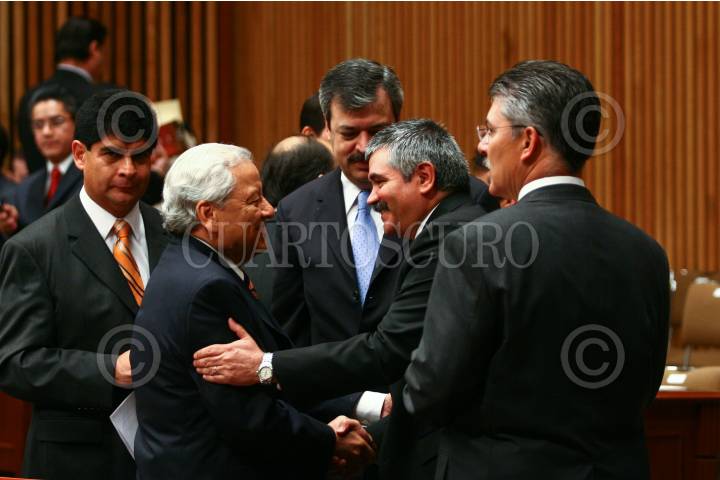 MÉXICO, D.F., 10JULIO2008.- El diputado por Convergencia Elías Cárdenas Márquez saluda al consejero presidente del IFE, Leonardo Valdés Zurita, previo al inicio de la sesión extraordinaria del Instituto. En la imagen, los consejeros Andrés Albo Marquéz y Marco antonio Gómez Alcántar. FOTO: ISAAC ESQUIVEL/CUARTOSCURO.COM
